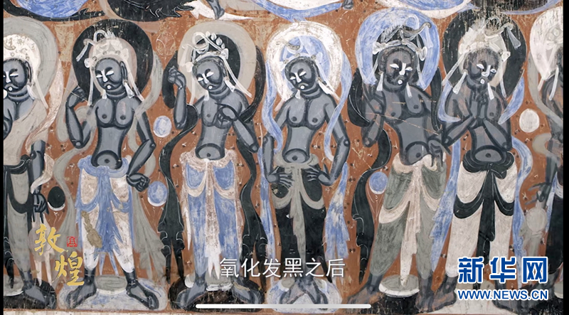 “‘敦煌仿妝’好了,我們一起去看看壁畫原作吧!”鏡頭一轉,班銳從美妝博主成了穿著工作服的講解員。
