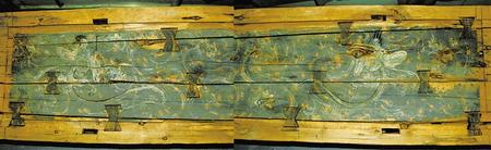 1998年新城魏晉南墓出土。這副完整的木棺由棺身和棺蓋組成,棺蓋內(nèi)側(cè)有一長方形凹面,內(nèi)彩繪伏羲女媧圖。伏羲女媧人首蛇身,兩尾相交,伏羲在右,左手執(zhí)矩,女媧在左,右手執(zhí)規(guī)。伏羲女媧周圍飾云氣紋。棺身呈長方體,兩檔頭用墨線勾畫星象圖,棺內(nèi)側(cè)四壁彩繪幃帳、絹帛、蠶繭等圖形。