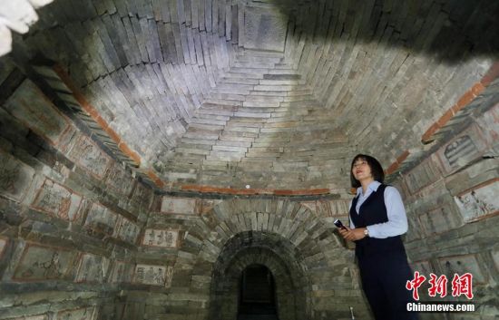 位于甘肅嘉峪關市的嘉峪關新城魏晉墓群,內(nèi)有千余座魏晉古墓,從1972年起,先后發(fā)掘18座,其中9座為畫像磚墓。磚壁畫取材于現(xiàn)實生活,用連環(huán)畫的方式反映出了當時河西地區(qū)生活、生產(chǎn)、軍事、文化的真實情景,具有濃厚的生活氣息。目前只開放的六號墓,其壁畫內(nèi)容豐富,具有很強的代表性。高展 攝