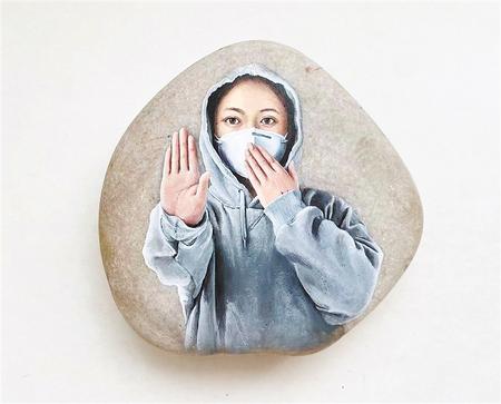 此前,馬玉蘭的黃河石畫是將傳統(tǒng)工筆與寫意、油畫與彩墨、彩繪藝術(shù)與現(xiàn)代審美元素相融合,按照石頭的天然紋理,用細(xì)膩的線條和多樣的色彩,描繪花鳥魚蟲的神態(tài)和意趣。疫情發(fā)生以來,她的作品轉(zhuǎn)向了人物寫實,不再“借物抒情”,而是“直抒胸臆”。