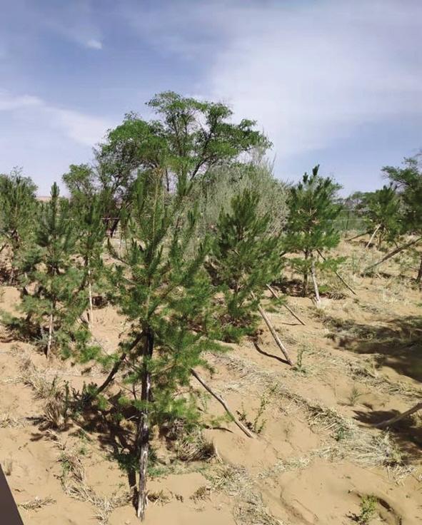 我和同伴撲進沙海柔軟的懷抱。認識到,再小的沙粒,也不能與塵世隔絕,我與沙,結(jié)緣于此。沙海里,一沙一世界。黃沙大膽赤裸地暴露在天幕蒼芎下,以大,以小,涵納無窮。“沙沙”的足音里,印下我深深淺淺兩行腳印,宣告著浪漫與踏實的存在。我來到習近平總書記親手栽植的“五棵松”下,仰視青松,綠云葳蕤,生機勃勃。總書記的關(guān)懷和鼓勵,黃沙熱熱地、輕輕地長出了更多綠色羽翼,這羽翼在不斷地生長壯大,有“代代相傳”的精神,綠色終究會覆蓋全部騰格里。捧起一捧黃沙,細沙像嬰兒肌膚般的柔滑,我試圖用臉貼近它,這些黃色的小精靈,從我指縫間輕盈地流淌到松下,似乎在暗示我,要把自己的夢筑進治沙精神的瀚海里??茖W家們已作出結(jié)論:沙漠是人類最后的寶地,別看它現(xiàn)在荒蕪,它里面蘊藏著無盡的寶藏和財富。