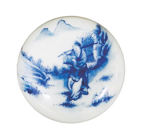 一件是青花印泥盒,制作于20世紀(jì)初。直徑7厘米,高3厘米,盒身扁圓,鼓腹,上下相合。盒蓋用青花繪“樵夫讀書”圖。畫面遠(yuǎn)處,兩座山峰高聳云間,四周樹木蔥蘢,山石嶙峋。畫面正中的山路上,一樵夫砍柴歸來,身背一大捆柴草,他右手扶著木棍,左手則捧著一本書,雙眼盯著書本,緊抿嘴唇,正津津有味地邊走邊讀。讀到精彩處,露出會心一笑??磥?,這個(gè)樵夫是極愛讀書的,這種好學(xué)精神,難道不值得我們學(xué)習(xí)嗎?這件瓷印泥盒,青花色澤典雅,人物衣褶神態(tài)描繪細(xì)致,栩栩如生,胎體堅(jiān)致,白釉溫潤,層次清晰,保存完好。