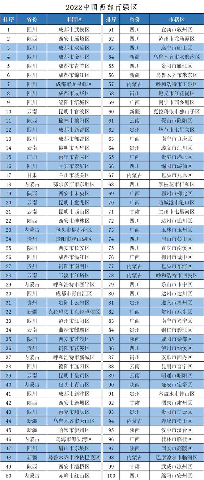 《中國西部地區(qū)縣域發(fā)展監(jiān)測報告》由競爭力智庫、北京中新城市規(guī)劃設計研究院等機構聯(lián)合編制,監(jiān)測評價對象為西部12個省(自治區(qū)、直轄市)的全部縣域單位,從經(jīng)濟規(guī)模、人民生活、經(jīng)濟活力、發(fā)展質量等四個方面進行評價,四個分項指數(shù)合成競爭力指數(shù)。其中,縣(縣級市、自治縣、旗、自治旗、特區(qū))競爭力指數(shù)前100名為“中國西部地區(qū)綜合競爭力百強縣市”,簡稱“中國西部百強縣市”或“西部百強縣”;市轄區(qū)競爭力指數(shù)前100名為“中國西部地區(qū)綜合競爭力百強區(qū)”,簡稱“中國西部百強區(qū)”或“西部百強區(qū)”。今年,課題組在開展西部地區(qū)縣域發(fā)展監(jiān)測評價的基礎上,還聯(lián)合有關單位和專家,分區(qū)域、分類型總結了“2022中國西部地區(qū)縣域高質量發(fā)展典型案例”,準格爾旗、平果市、仁壽縣、彭州市、瀘縣、吳起縣、玉門市、開陽縣、大竹縣、彬州市、成都市雙流區(qū)、西安市雁塔區(qū)、昆明市官渡區(qū)、包頭市昆都侖區(qū)、克拉瑪依市克拉瑪依區(qū)、貴陽市觀山湖區(qū)、南寧市青秀區(qū)、蘭州市城關區(qū)、西寧市城西區(qū)、銀川市興慶區(qū)等20個縣(市、區(qū))入選典型案例名單,供全國交流學習。