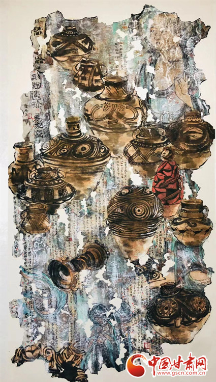 他的這幅作品《絲路遺珍-馬家窯》于2018年獲甘肅美術專業(yè)最高獎“金駝獎”,采用黃河的“s”型構圖展開,將八千年前新石器時代大地灣文化、馬家窯文化的經(jīng)典代表器物分次展開。作品左上角及中間部分依次疊加,穿插,繪制中與敦煌文化中的壁畫、飛天、佛像有機結合,寓示絲路文化有序傳承、源遠流長,又對畫面的視覺撥高提升。