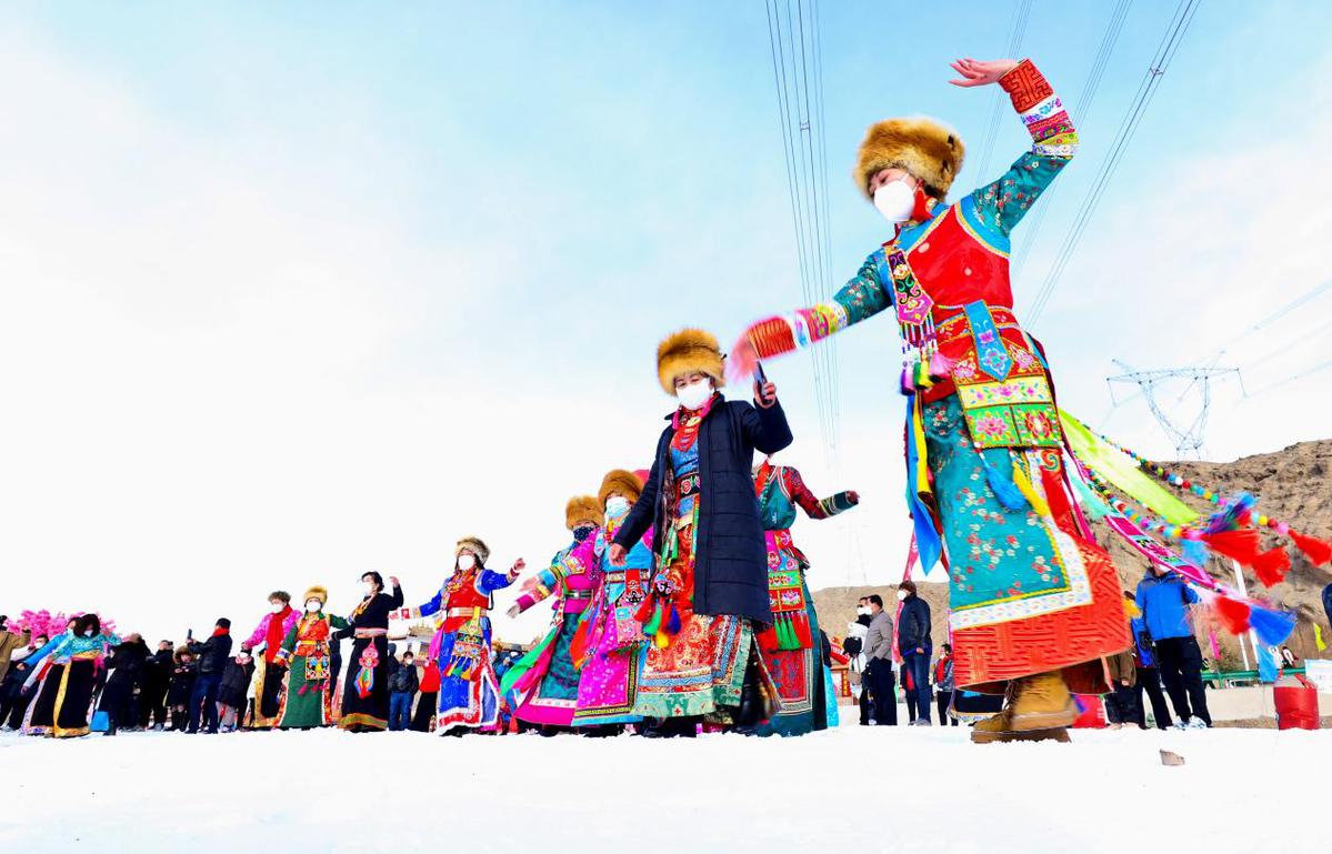 當(dāng)日,“相約文殊山樂(lè)享冰雪趣”,藏族群眾在冰雪運(yùn)動(dòng)場(chǎng)上進(jìn)行雪地鍋莊舞、頂杠子、拔棍、拉爬牛、戶外徒步、雪地摔跤、雪圈滑行追逐、滑冰、電商直播等多項(xiàng)比賽,吸引了周邊群眾和甘肅酒泉、嘉峪關(guān)等地的萬(wàn)名游客前來(lái)參觀游覽和參與比賽。