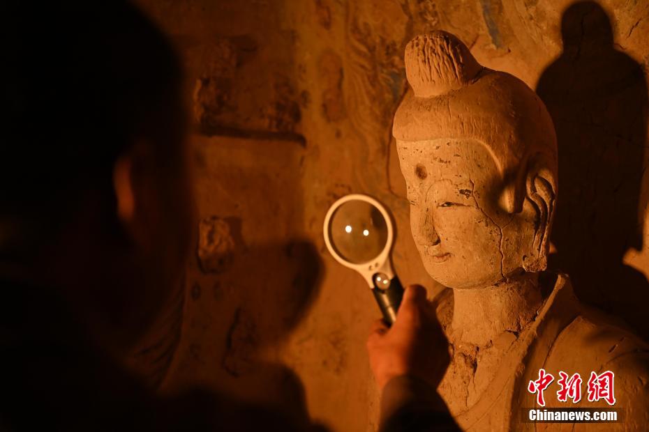 有時(shí)候看似簡(jiǎn)單的佛像修復(fù)會(huì)遇到各類(lèi)不同的文物病害,修復(fù)時(shí)間會(huì)長(zhǎng)達(dá)三年之久,他也見(jiàn)證了文物修復(fù)技藝的變遷。隨著科技進(jìn)步文物修復(fù)手段也變得越來(lái)越先進(jìn),他認(rèn)為未來(lái)的文物保護(hù)工作一定會(huì)越來(lái)越好,年輕文保工作者們也一定會(huì)想盡更多辦法留住這座世界文化遺產(chǎn)。圖為8月25日,文物修復(fù)師牟常有正在仔細(xì)觀察佛像表面出現(xiàn)的病害問(wèn)題。李亞龍 攝