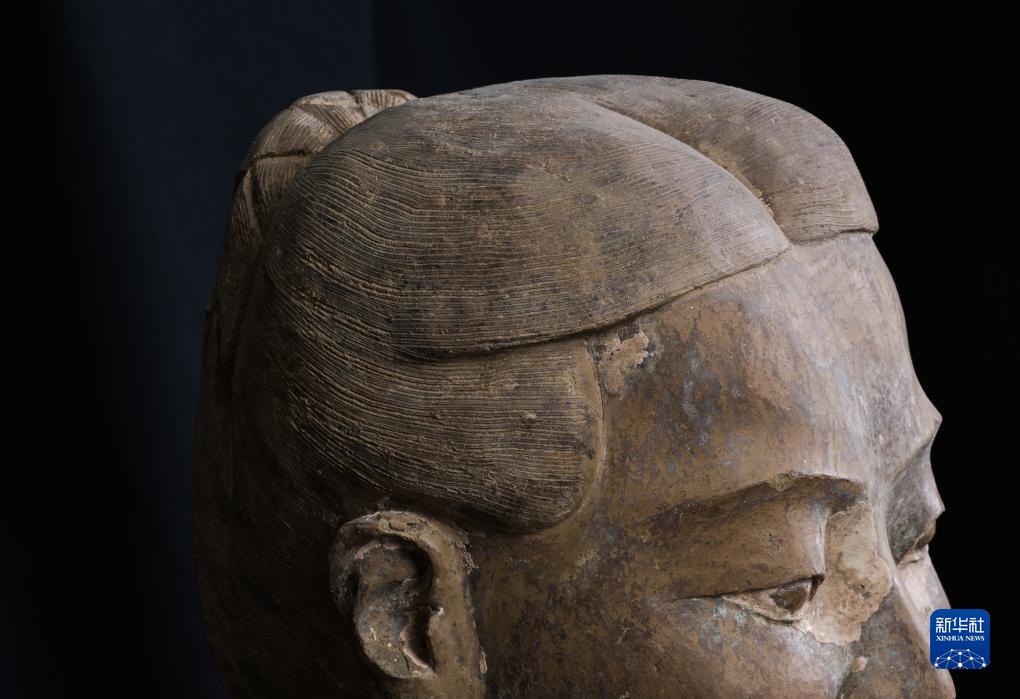 在秦始皇帝陵博物院文物保護部彩色陶俑修復室內,一尊秦俑的頭發(fā)分毫畢現( 8月23日攝)。