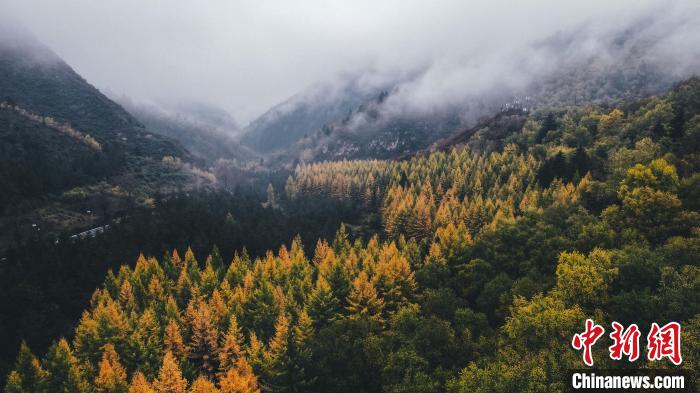 深秋,航拍位于蘭州市榆中縣的興隆山,景色如畫。金峯 攝</p>