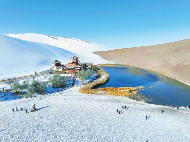 受冷空氣影響,11月14日晚,敦煌市迎來入冬以來的首場降雪。雪后的鳴沙山月牙泉景區(qū)銀裝素裹,景色如畫。游客踏雪而來,拍照打卡,感受大漠里難得一遇的雪后美景。