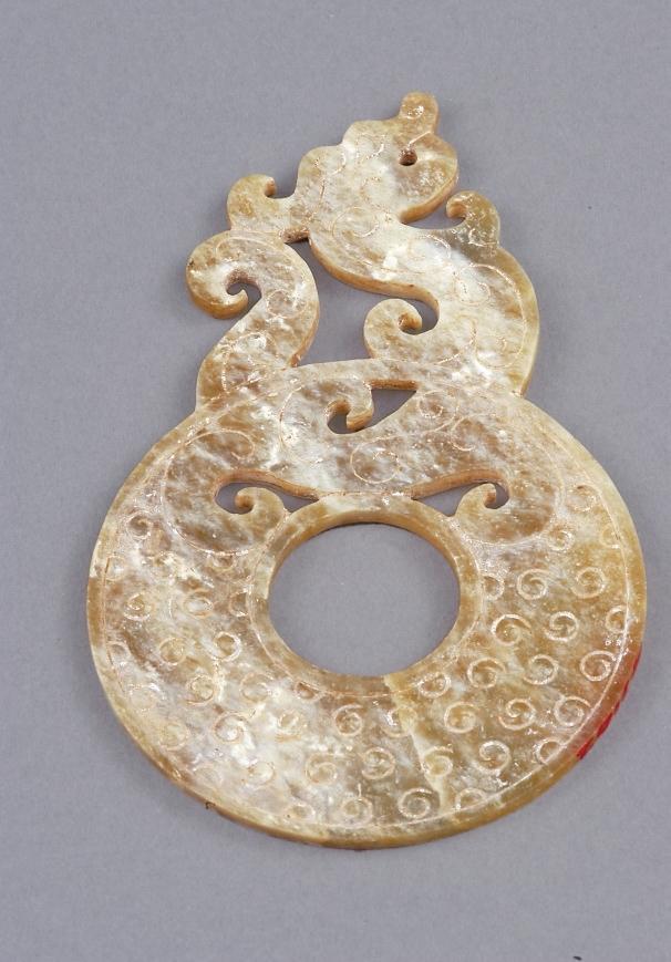 甘肅省博物館藏的漢代鏤雕龍紋璧,龍昂首,軀體屈曲,尾部上卷貼于首后,有騰空而起之勢。龍形玉器表現(xiàn)了古人將龍融入禮器之中,希望借此上達(dá)天庭,得到神靈與祖先的庇佑。