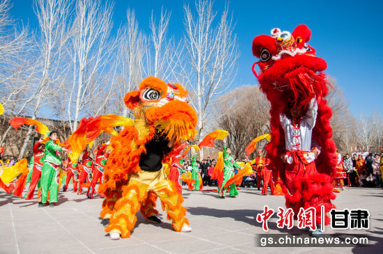 2024年2月14日,甘肅省敦煌市社火隊(duì)正在白馬塔景區(qū)進(jìn)行社火——舞龍表演。