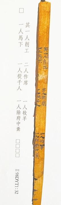 簡7是都尉府戍卒日作簿,戍卒分工簡明清楚。“削工”用紅柳、胡楊木削制簡牘。作席,疏勒河沿岸生長著大量芨芨草、蘆葦,戍卒用來編制席笆,用于防潮御寒。疏勒河沿岸水草豐茂,適宜放牧。“一人牧羊”可知,養(yǎng)牛、羊供都尉府吏員食用。“一人馬下”,由于缺當(dāng)時的語言環(huán)境,釋義模糊。千人是都尉府中級軍官職務(wù)。除府中糞,清除廁所糞便。