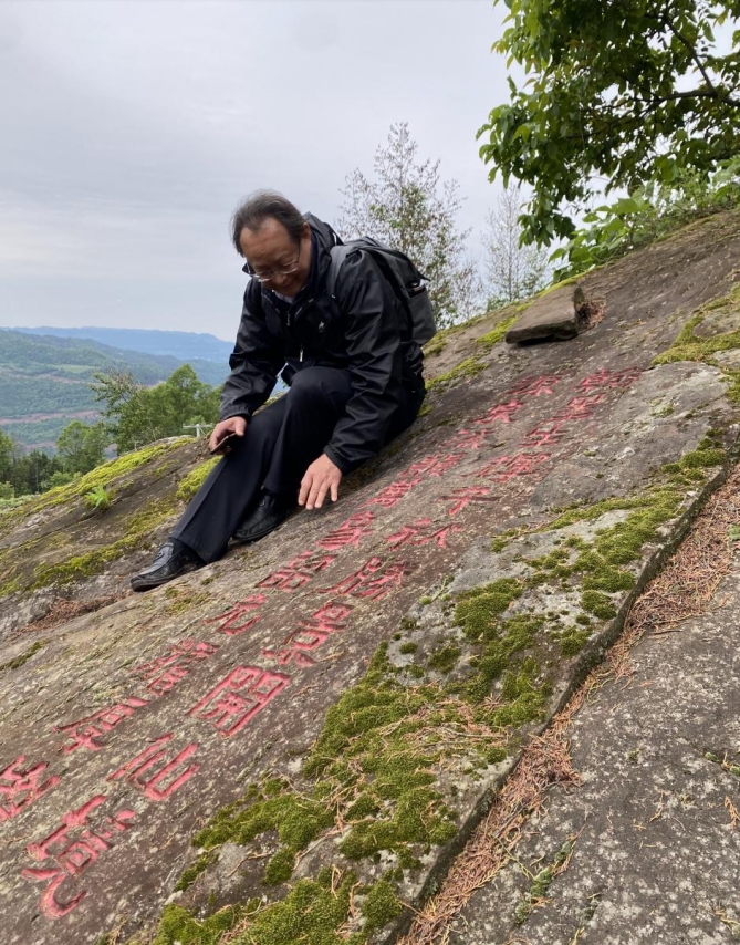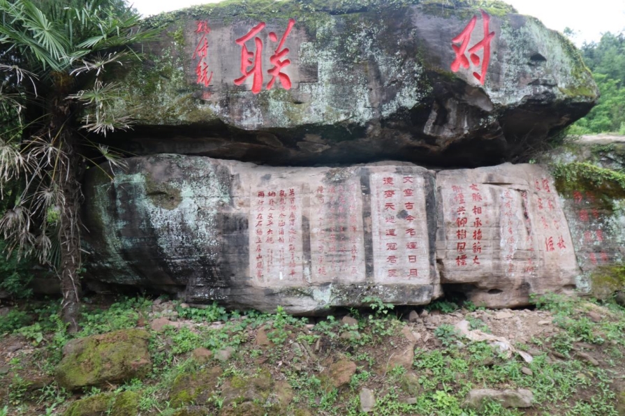 山上隨處是石,或臥或立,俱有雄獅虎豹之勢;或平或峻,皆作岡陵之態(tài)。青峰續(xù)脈,絕頂鷹飛。鑿巖壁以造法像,栩栩如臨宮闕;摩巨石而鐫嘉聯(lián),文華直射牛斗。石多瑰偉,苔覆璞瑜,油菜花點綴其間,引來蜜蜂蝴蝶共舞。山茶與毛竹同畦,郁郁蔥蔥;峰巒與云煙共養(yǎng),莽莽蒼蒼。遇目石上鐫字,瀏賞翰墨煙霞;振藻揚(yáng)毫,皆寰中俊杰;椽筆斯文,多隴蜀賢達(dá)?;虺嘧痈文?,燭照于史;或凜然浩氣,嘯傲大千。聯(lián)壁生輝,文曲星彰;峣巖開竅,氣通神明。文采煥然與星河同輝,詩儕競秀潤厚山玉顏。壯懷詩夢,漱玉溪流。在一塊巨石斜面上,有同伴發(fā)現(xiàn)刻有筆者所書長聯(lián),興奮得喊叫起來。這是三年前應(yīng)曹興章先生之約而作,聯(lián)曰:翰墨生輝,千秋勝景開仙境;源泉流韻,萬象韶光耀厚山。我用手指扣去筆畫生出的茂密青苔,坐下來與我的聯(lián)合影留念。信是蓮花開石上,遙遙至此結(jié)仙緣。