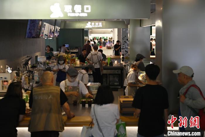6月19日,甘肅省博物館藝術生活館在甘肅蘭州開館。該館是甘肅省博物館打造的一處復合型高價值文化空間,融合了咖啡、烘焙、展覽、藝術書店、文創(chuàng)銷售等多樣化業(yè)態(tài)。圖為游客在咖啡區(qū)排隊等待。中新社記者 李亞龍 攝