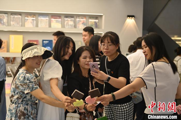 6月19日,甘肅省博物館藝術生活館在甘肅蘭州開館。該館是甘肅省博物館打造的一處復合型高價值文化空間,融合了咖啡、烘焙、展覽、藝術書店、文創(chuàng)銷售等多樣化業(yè)態(tài)。圖為顧客與自己挑選的蘭州凍梨文創(chuàng)玩偶合影。中新社記者 李亞龍 攝