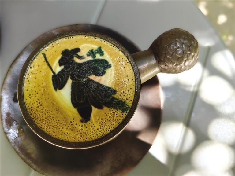 驚喜還有很多,就像店內(nèi)柜體上的一句話“可以讓大家體會到我們不一樣的用心”,這些年輕人用心起來還真能撬動地球。飲品和咖啡,設(shè)計團(tuán)隊愣是把口味和地域文化結(jié)合起來,整出了幾款“限量版”:城市限定——沙橙暴飲品,西北特有;特調(diào)咖啡——苦水玫瑰特調(diào),讓人一口難忘之余還配上了臺詞,“苦水玫瑰有點(diǎn)甜”;“文物咖啡”更是占據(jù)“C位”,咖啡拉花機(jī)“印制”而成的微縮版銅奔馬、蛙紋罐、銅車馬等文物圖案浮在濃郁的咖啡上,精致、唯美。這還不算,咖啡器皿的名稱也非同尋常——鷹首權(quán)杖杯。陶瓷來自景德鎮(zhèn),手柄是省博鷹頭形青銅權(quán)杖首的文物原型。驚嘆、贊美、感慨,每一位品嘗之人喜愛之余竟不忍飲用。