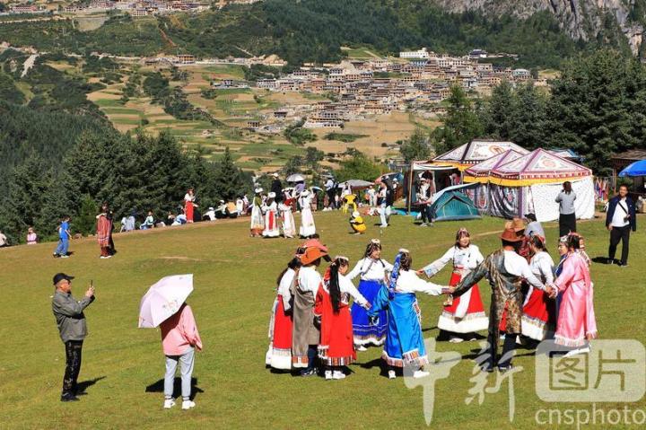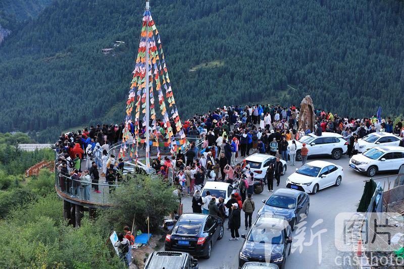 8月19日,游客在扎尕那景區(qū)仙女灘游玩。扎尕那景區(qū)位于甘肅省甘南藏族自治州迭部縣益哇鎮(zhèn),藏語(yǔ)意為“石匣子”,整個(gè)景區(qū)平均海拔在3000米以上,四周群山環(huán)抱,山頂云霧繚繞,森林、草原、青稞梯田與獨(dú)特的人文景觀互補(bǔ)整合,藏式民居點(diǎn)綴其間,吸引游客前來(lái)參觀游玩。中新社發(fā) 陳永剛 攝