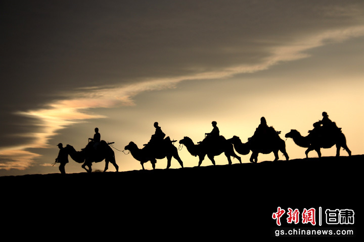 9月1日清晨,游客走進(jìn)甘肅省敦煌市鳴沙山月牙泉景區(qū),乘騎駱駝欣賞大漠風(fēng)光,體驗(yàn)絲路風(fēng)情。