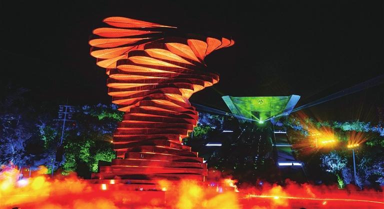 秋日的金川國家礦山公園樂聲悠揚(yáng)、光影迷離。夜晚,伴隨著動(dòng)人的旋律,絢爛的光影投射到主界碑“龍首魂”上,金昌元素生動(dòng)地展現(xiàn)在眼前,“鎳都之光”文化展演為旅客帶來了一場(chǎng)視覺盛宴。