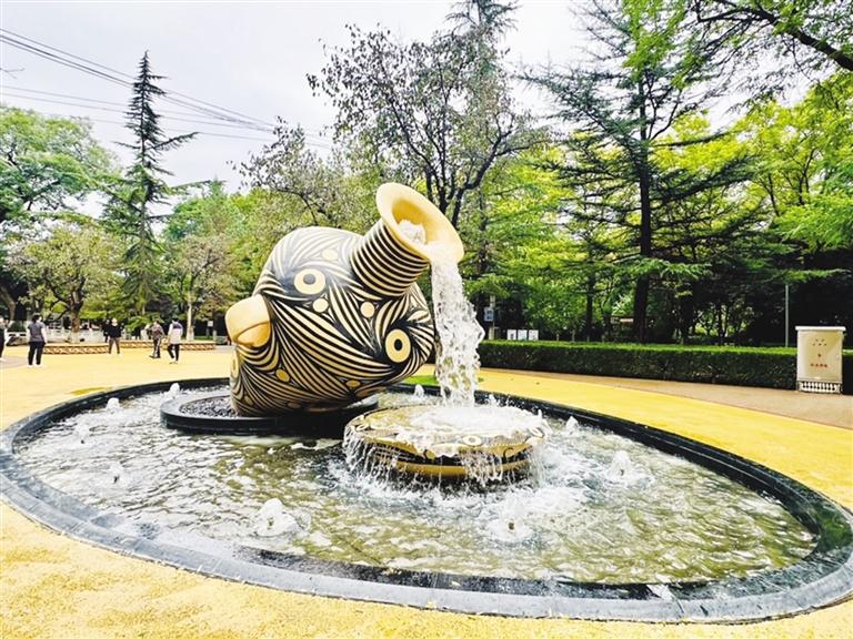 走進(jìn)公園(東口),入口處以“大河厚土孕彩陶”為主題的彩陶墻格外顯眼,墻上鑲嵌著不同造型和樣式的彩陶,分別介紹了大地灣文化彩陶、仰韶文化彩陶、馬家窯文化彩陶、齊家文化彩陶四個不同歷史發(fā)展時期。沿健身步道向西行進(jìn),體量巨大的馬家窯旋紋彩陶尖底瓶正向旋紋彩陶盆內(nèi)倒入“黃河之水”,這一景觀便是“彩陶流水”節(jié)點,景觀造型采用跌水、涌泉的形式,打造出彩陶流水的動態(tài)效果,象征著黃河文化的源遠(yuǎn)流長。