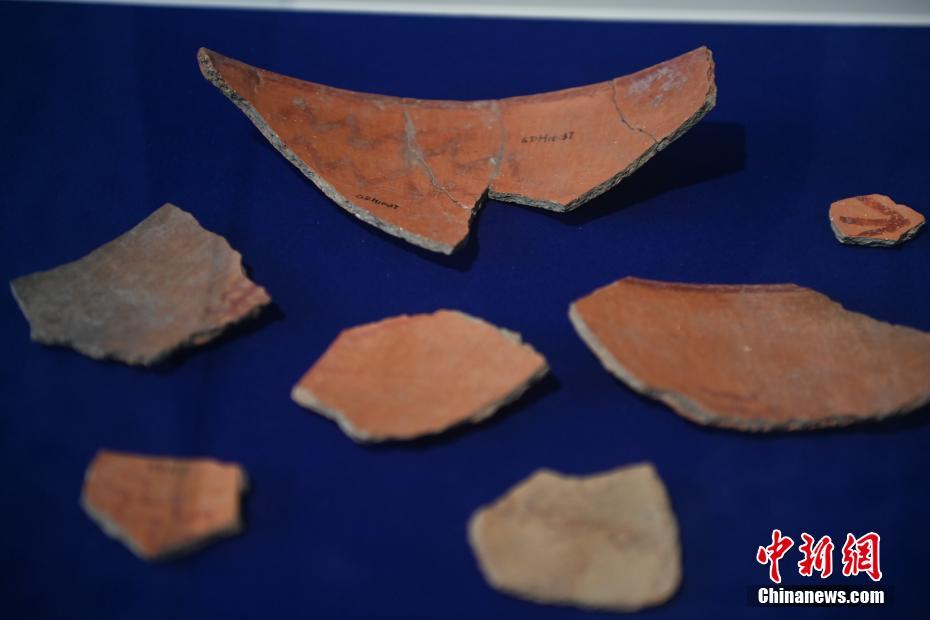 ?。保霸拢玻踩?,2024青年漢學(xué)家研修計劃甘肅班團隊22個國家的青年漢學(xué)家,走進甘肅省天水市秦安縣大地灣遺址參觀并進行專題研修。大地灣遺址是新石器時代大型聚落遺址,出土了中國乃至世界上最早的彩陶文化、最早的文字符號、種植生產(chǎn)了中國第一批糧食品種黍、出現(xiàn)了最早的宮殿式建筑、發(fā)明了世界最早的水泥地面、創(chuàng)造了最早的繪畫作品——F411地畫。圖為大地灣博物館展品最早的文字符號彩繪符號陶片。中新社記者 李亞龍 攝