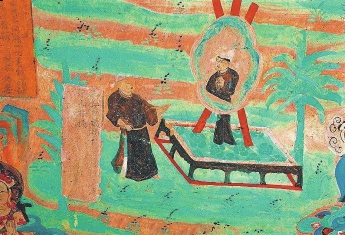 戰(zhàn)國(guó)時(shí)期楚國(guó)詩人屈原在《漁父》一文中寫道:“吾聞之,新沐者必彈冠,新浴者必振衣。安能以身之察察,受物之汶汶者乎?”意思是說我聽說剛洗過頭的人一定會(huì)去彈彈帽子上的灰塵;剛洗過澡的人一定要抖抖衣服的灰塵。怎能讓清白的身體去接觸世俗塵埃的污染呢?當(dāng)年的敦煌人走出溫泉,在身心放松之后,就該靜觀返照自己了。在莫高窟第85窟中有一幅“曲花式鏡圖”:畫面上在一個(gè)正方形鏤空的底座上擺放著一個(gè)巨大的曲花式鏡,鏡子式樣別致,明亮澄澈。藍(lán)色的曲花式樣引人矚目。但畫面上最吸睛的是一位魁梧俊朗身著一襲赭色長(zhǎng)袍的男子,他正在鏡子前仔細(xì)地打量自己,而鏡中映射出他神情凝重的情態(tài)來。原來,古人照鏡除了正衣冠之外,還有反觀自照的含義,在鏡子前良久地注視自己,就是對(duì)自己反省、頓悟的過程。“一年好景君須記”,走過四季,到了歲末,該是每個(gè)人回望來時(shí)路,展望前方的時(shí)候了。