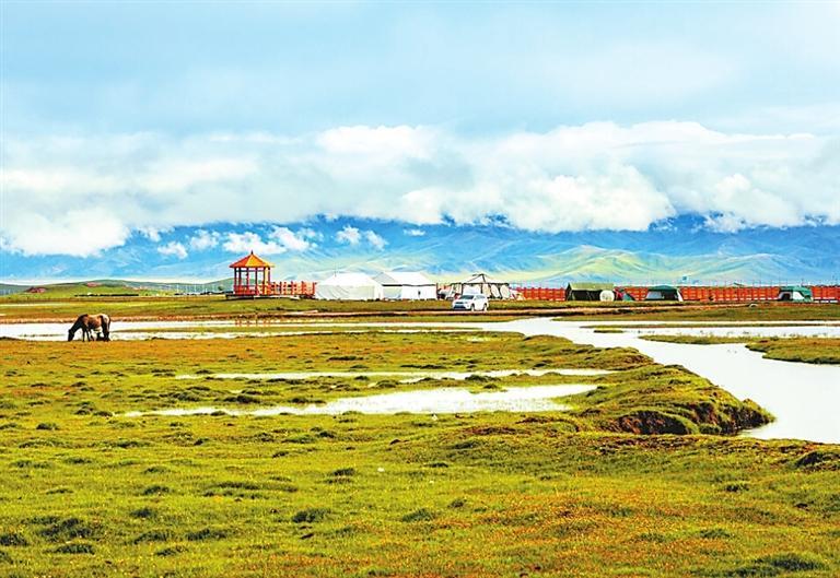 河曲馬場景區(qū)以熱爾欽濕地草原、熱爾欽湖為主要自然景觀,目前建有神駒廣場、高原馬術活動基地、步行街、親水濕地觀光平臺、星空帳篷酒店、房車帳篷營地、熱氣球觀光基地、瑪緹高端酒店等配套附屬設施。大自然在這里集高原湖濱濕地、沼澤濕地、高寒草原于一體,構成了復合型的別樣景觀。
