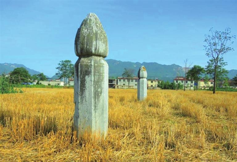 平闊的川地,村人已把一地莊稼收入自己殷實的谷倉,田野涂遍了陽光的顏色。遠遠地,我們就看見一座有兩尊八楞蓮苞頭華表矗立在田野之間,在另一塊地里,還有一個僅裸露肩膀于地表、頭顱已缺失的石翁仲,圓領官服、胸垂綬帶的文官裝束隱約可見……