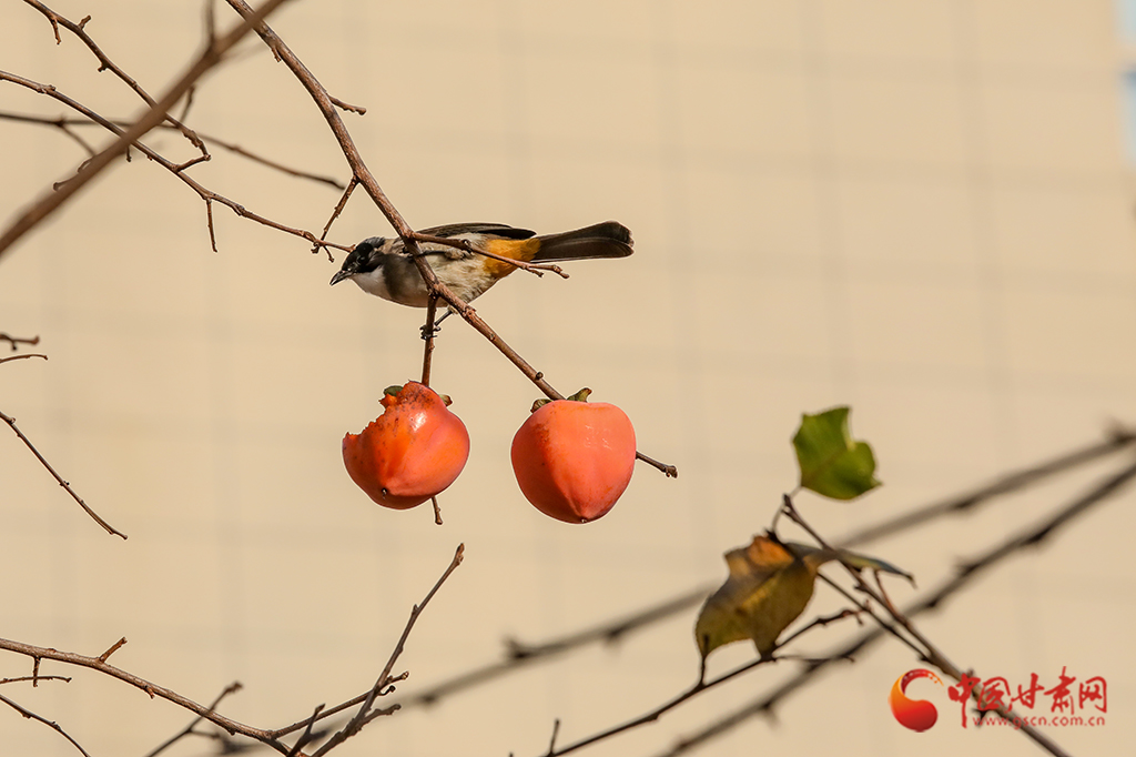 繁華落盡,枝條上一簇簇、一叢叢火紅的柿子在微風(fēng)中搖曳,吸引麻雀前來“聚餐”。麻雀們時而啁啾歡唱,時而蹦跳覓食,小巧的身影與柿子交織在一起,勾勒出一幅生動的冬日畫卷。