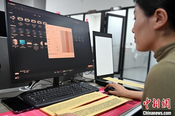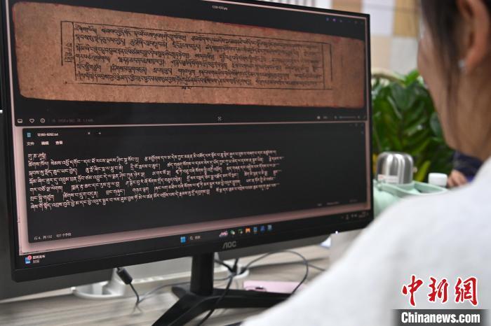 2月27日,在甘肅甘南藏族自治州碌曲縣益西達(dá)吉科技有限公司內(nèi),工作人員正在進(jìn)行藏文古籍?dāng)?shù)字化相關(guān)工作。該公司主要從事民族古籍?dāng)?shù)字化建設(shè)和古籍文獻(xiàn)數(shù)據(jù)庫建設(shè),自2019年以來,承擔(dān)西藏、四川、甘肅等省區(qū)的藏文古籍?dāng)?shù)字化項(xiàng)目。圖為工作人員用該公司研發(fā)的藏文信息處理系統(tǒng)對古籍?dāng)?shù)字化內(nèi)容進(jìn)行檢查。中新社記者 九美旦增 攝