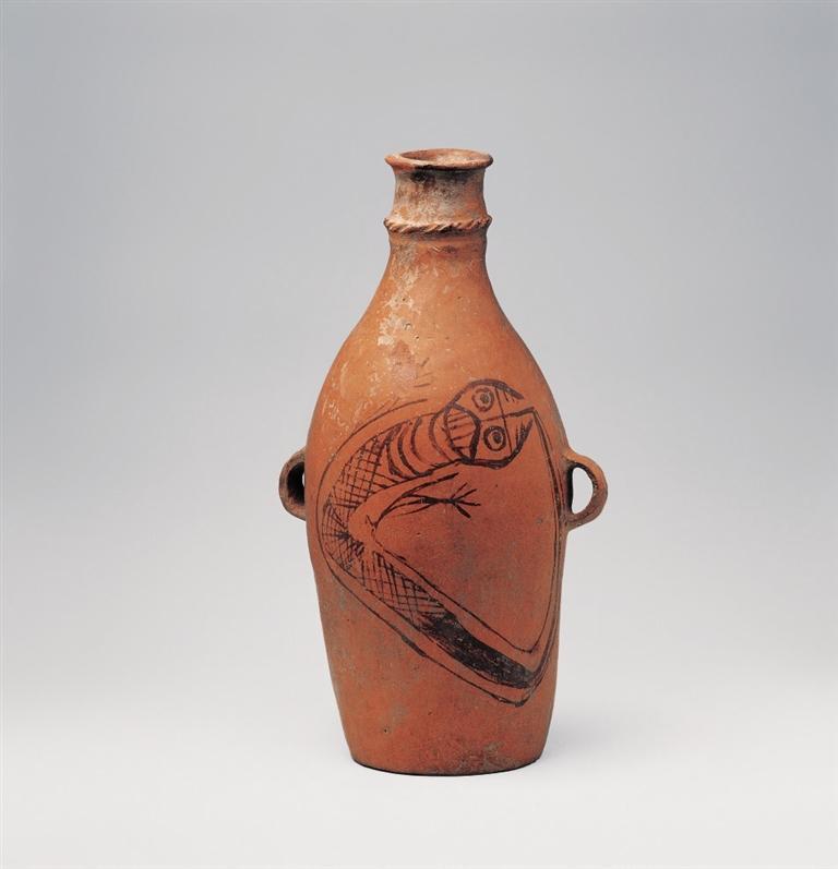 仰韶文化石嶺下類型(距今5200年前)甘谷縣西坪出土高38.4厘米,口徑7厘米,底徑12厘米。小口、長(zhǎng)頸、平底、腹上部有雙耳,頸部有堆紋一圈。瓶腹繪黑色人首形的鯢魚(yú)圖樣,一雙短臂向外伸出,全身為斜格紋,尾部彎曲。