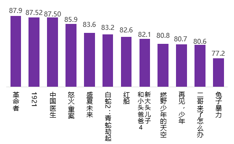 調(diào)查顯示,《革命者》《1921》《中國醫(yī)生》三部影片的滿意度得分分別為87.9分、87.52分、87.50分,分列2021年暑期檔影片滿意度排序的前三位。動(dòng)作片《怒火·重案》、青春片《盛夏未來》和動(dòng)畫片《白蛇2:青蛇劫起》滿意度居檔期第4至6位。