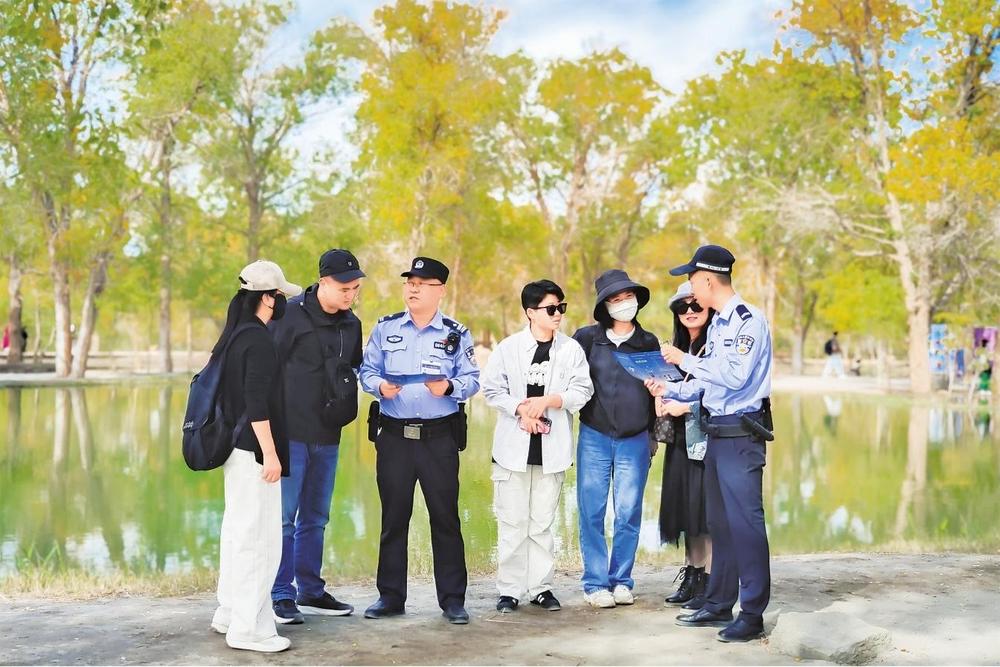 同時,運(yùn)用智慧警務(wù)加強(qiáng)對景區(qū)人流量的動態(tài)掌握,適時調(diào)整巡防策略,在林區(qū)、夜市、游樂場等關(guān)鍵部位,民輔警利用大喇叭播報(bào)安全提示、面對面宣講等方式,有針對性開展防火防盜、交通安全、預(yù)防電詐等安全知識宣傳,向游客傳播“胡楊精神”、講好金塔故事,用“零距離”服務(wù)、全時空守護(hù)提升游客獲得感、幸福感和滿意度。