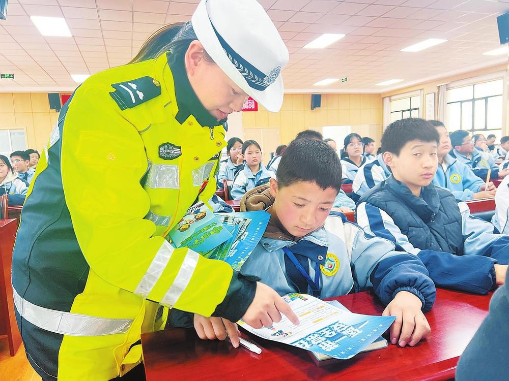 民警向?qū)W生講解交通安全知識(shí)。2月26日,臨潭縣公安局交警大隊(duì)組織民警走進(jìn)臨潭縣回民中學(xué),開(kāi)展交通安全進(jìn)校園宣傳活動(dòng)。 新甘肅·甘肅法治報(bào)記者金凡裕攝
