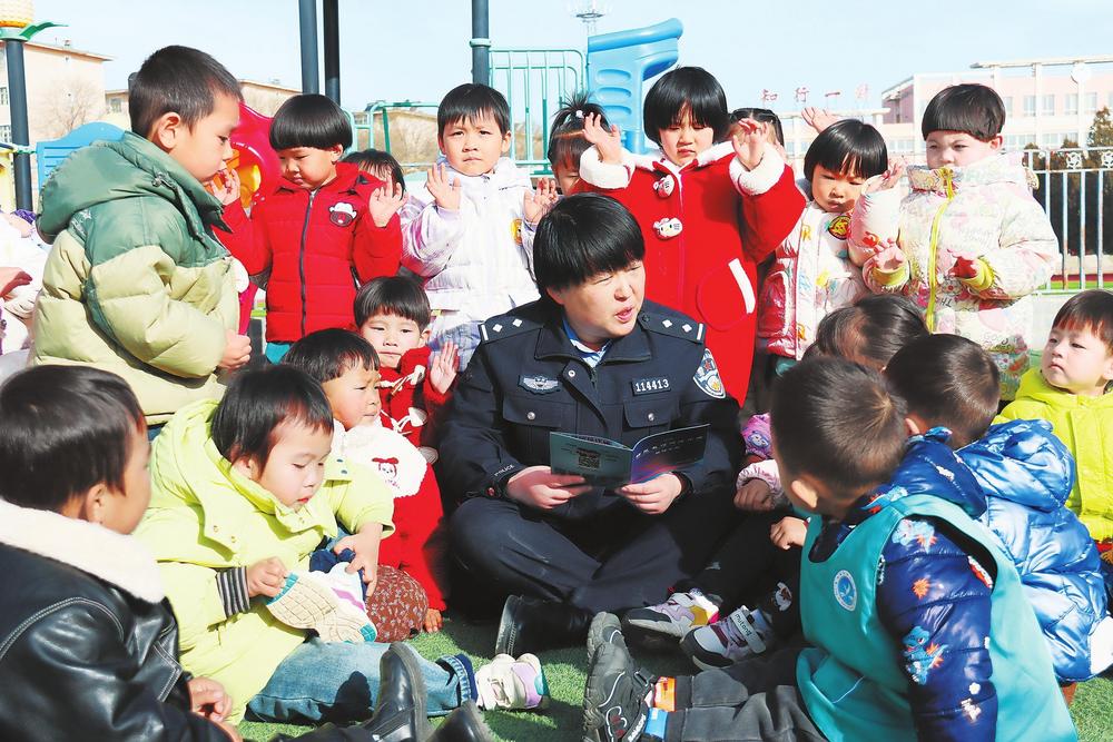 民警向小朋友講解法律知識(shí)。3月3日,隴西縣公安局西郊派出所民輔警走進(jìn)幼兒園,開展法治宣傳和安全教育。新甘肅·甘肅法治報(bào)通訊員朱艷霞攝