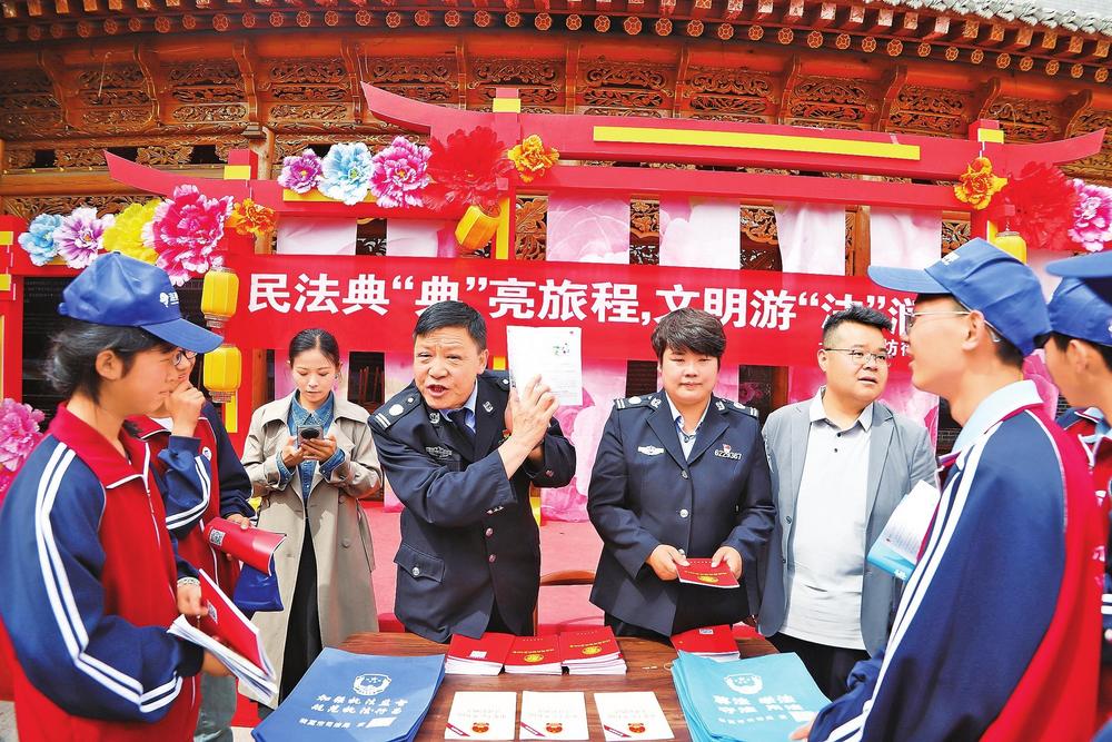 工作人員宣講民法典知識(shí)。5月11日,臨夏市司法局八坊司法所在蓋碗茶廣場(chǎng)開(kāi)展民法典主題宣傳活動(dòng)。新甘肅·甘肅法治報(bào)記者陳孝志攝