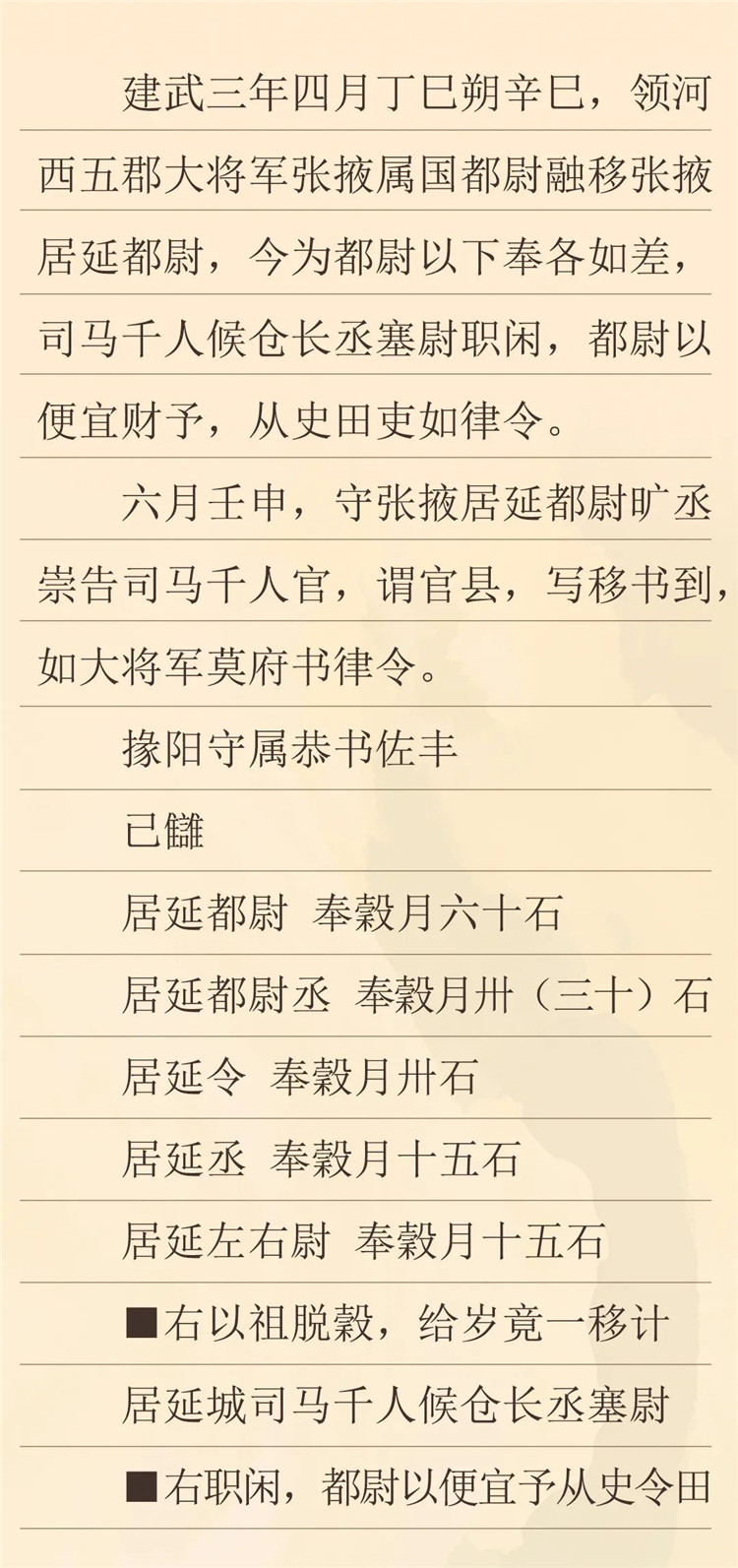 這封冊書記載了建武三年,竇融管轄河西時(shí)發(fā)布的一條關(guān)于都尉以下官吏奉谷等差的命令。根據(jù)竇融發(fā)布的新規(guī)定,我們可以看到,秩比二千石的居延都尉月奉谷僅為六十石,史書有“十斗一斛”及“十斗一石”的記載,此六十石即是六十斛,相比于史書記載中比二千石每月百斛的俸例要少,而其余官吏的俸祿也相應(yīng)要少,雖然漢代不同時(shí)期的官吏俸祿存在變化,但對比所見的這種情況,可能也跟兩漢之交戰(zhàn)亂頻仍的社會(huì)環(huán)境有重要關(guān)系。(李晶整理)