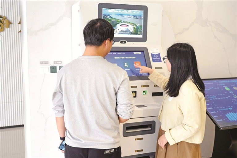 5月10日,浙江省平湖市林埭鎮(zhèn)徐家埭村的數(shù)智生活館內(nèi),村民在工作人員的幫助下,使用政務(wù)服務(wù)長三角“一網(wǎng)通辦”終端辦理業(yè)務(wù)。金苗 攝