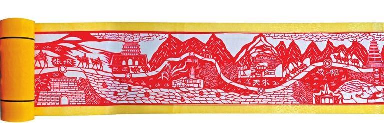 用剪紙藝術再現(xiàn)古絲綢之路的盛景,國家級非遺項目定西剪紙省級代表性傳承人付忠民經(jīng)過長時間的構思和調研,又歷經(jīng)5個月,終于創(chuàng)作出了長達23.38米的剪紙長卷——《古絲綢之路全圖》,再現(xiàn)了絲路古道的文化藝術魅力,該長卷曾一舉創(chuàng)下世界紀錄協(xié)會“世界上最長的剪紙長卷”的世界紀錄。