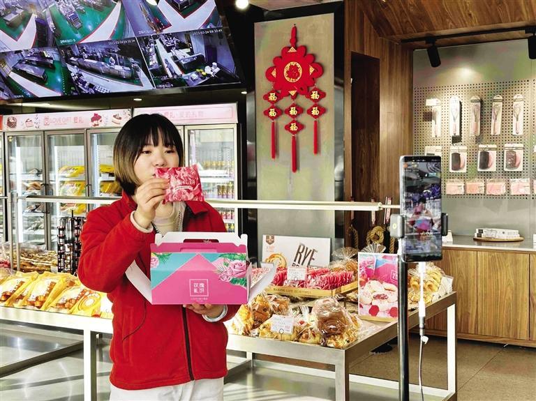 “第一次走進(jìn)直播間的粉絲一定要入手玫瑰禮餅,它是采用蘭州苦水玫瑰制作的……”每天上午,位于九州中路的愛禮烘焙生活工廠店內(nèi)一角,工作人員都在直播售貨。剛走進(jìn)店里就能聞到撲鼻而來的糕點(diǎn)香味,琳瑯滿目的商品讓人應(yīng)接不暇。