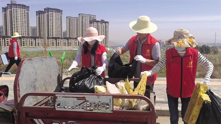在劉先生身后不遠(yuǎn)處,志愿者、網(wǎng)格員、環(huán)衛(wèi)工人等正在清理路旁垃圾,此時正值上午10時30分,驕陽似火,在經(jīng)四路與緯二十二路交界處,大家不畏炎熱,認(rèn)真撿拾著散落四處的垃圾,不論是煙頭紙片、白色垃圾,還是在雜草間的雜物,都被一一撿出,放在隨身攜帶的垃圾袋中,統(tǒng)一放回垃圾清運車。