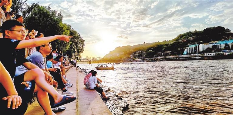 旅游旺季,游客在黃河邊納涼游玩。