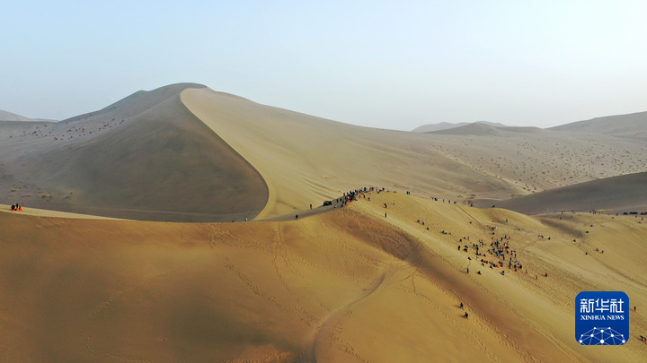 9月11日,游客在甘肅省敦煌市鳴沙山月牙泉景區(qū)游覽。新華社發(fā)(張曉亮 攝)