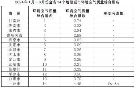 甘肅省生態(tài)環(huán)境廳發(fā)布2024年1月—8月份全省14個(gè)地級(jí)城市環(huán)境空氣質(zhì)量排名情況