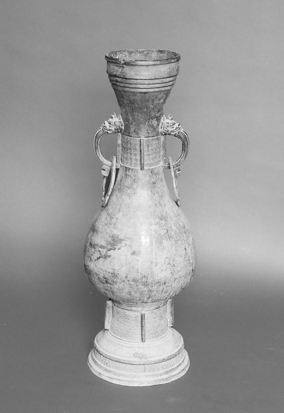明獸面銜環(huán)耳銅瓶:該銅瓶古樸修長(zhǎng)、厚重。銅瓶為一對(duì),形制及紋飾相同,高0.9米,口徑0.19米,重43.86千克。直口,外卷方唇,束長(zhǎng)頸,對(duì)稱置獨(dú)角獸吐舌形半環(huán)耳,下帶小珥,耳套如意形環(huán),垂膽形腹,束高脛,下為折肩形圈足,足口外撇,無(wú)底??谘叵嘛椚腊枷壹y,頸部飾四個(gè)等分菲棱,間以雷地紋,脛部飾四菲棱間以鱗形波浪紋,圈足飾菲棱形回紋。銅瓶原存放于崆峒山太和宮真武殿真武像前,置于韓王鼎左右。