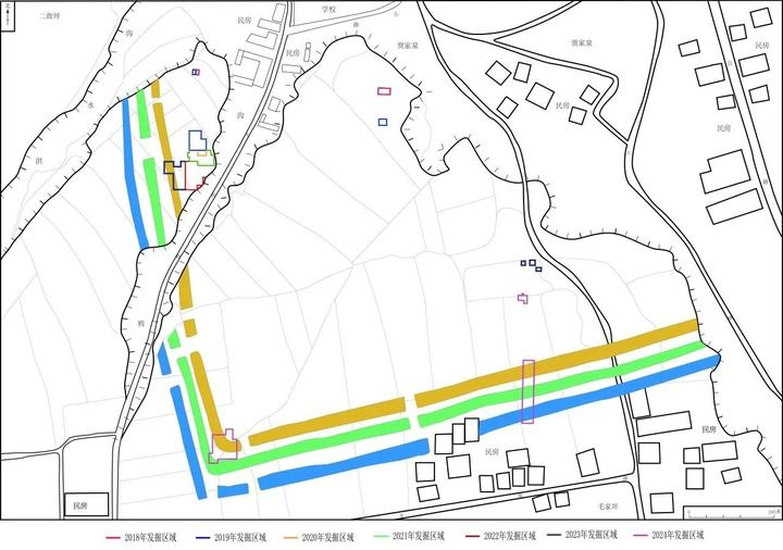 圖為甘肅省定西市臨洮縣寺洼遺址歷年發(fā)掘區(qū)及“圍壕(溝)”分布圖。(甘肅省文物考古研究所供圖)
