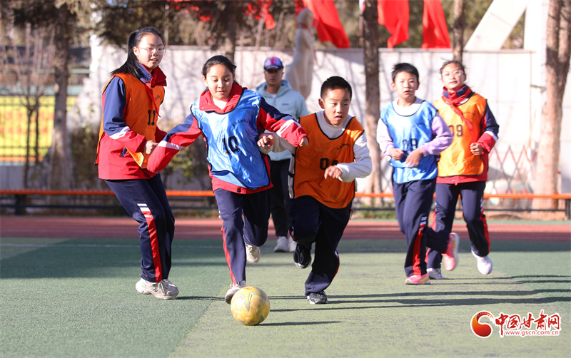 11月11日,在張掖市民樂縣洪水小學(xué)的足球場上,學(xué)生們在進(jìn)行足球訓(xùn)練。