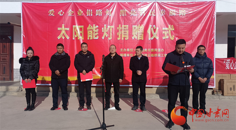 當(dāng)日,隴南市委網(wǎng)信辦還聯(lián)合禮縣工商聯(lián)、禮縣鼎通公路橋梁工程有限公司舉辦了“愛心企業(yè)捐路燈 照亮村民幸福路”捐贈儀式,為李壩村捐贈價(jià)值5萬元的260盞太陽能路燈,助力美麗鄉(xiāng)村建設(shè),照亮村莊夜晚。