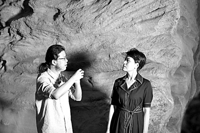 主講人王南(左)與主持人張小琴在云岡石窟現場交流。