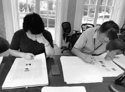 上海辭書出版社社長秦志華(右)和副總編輯張敏審讀《辭海》(第七版)校樣。